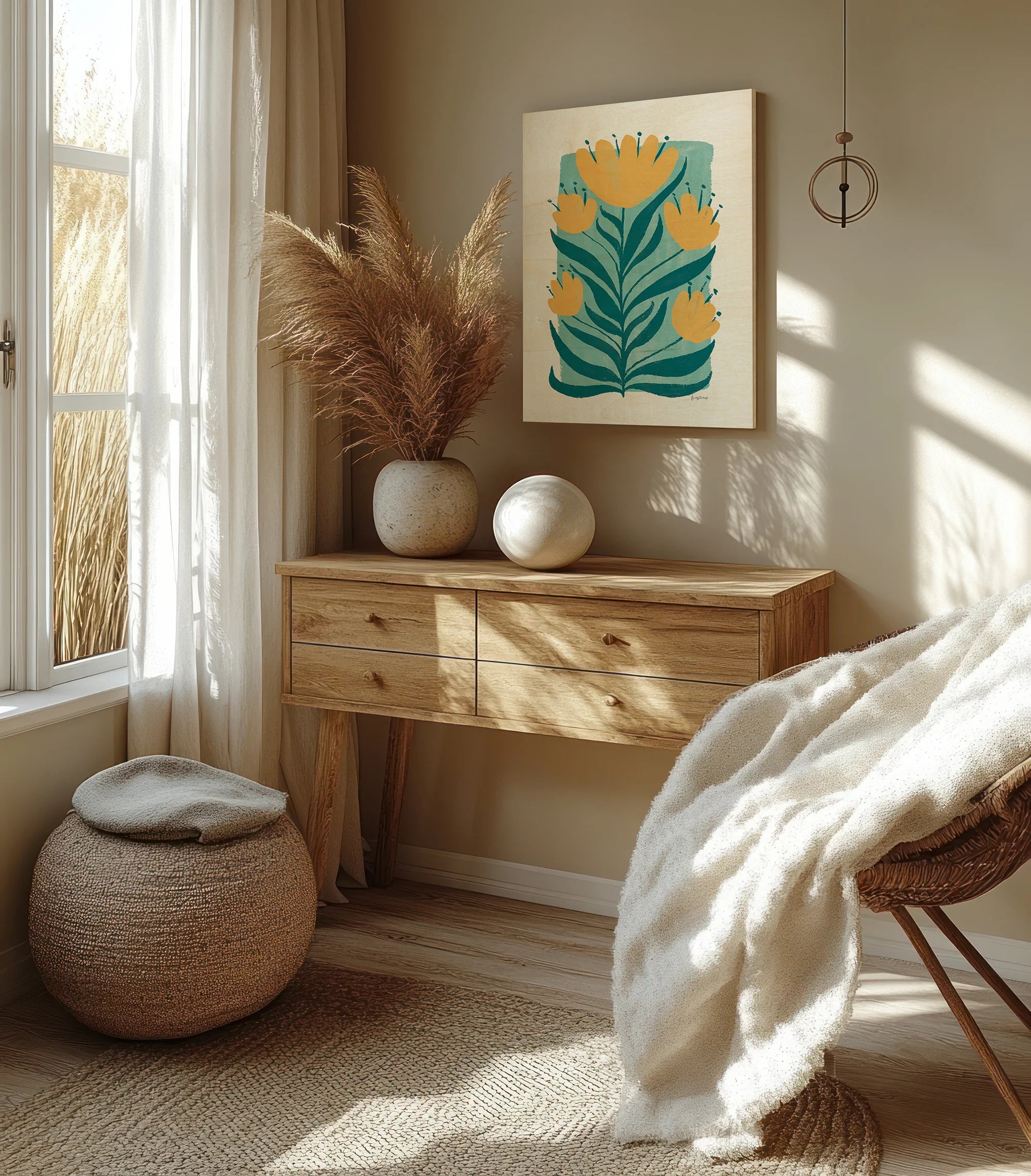 Scandi Flowers II Print by Becky Thorns is an abstract art print that adds depth and warmth to contemporary home décor. A versatile statement piece, perfect for living spaces, bedrooms, or creative interiors. Printed on premium 12mm Italian Poplar Plywood – finished & printed in Britain.