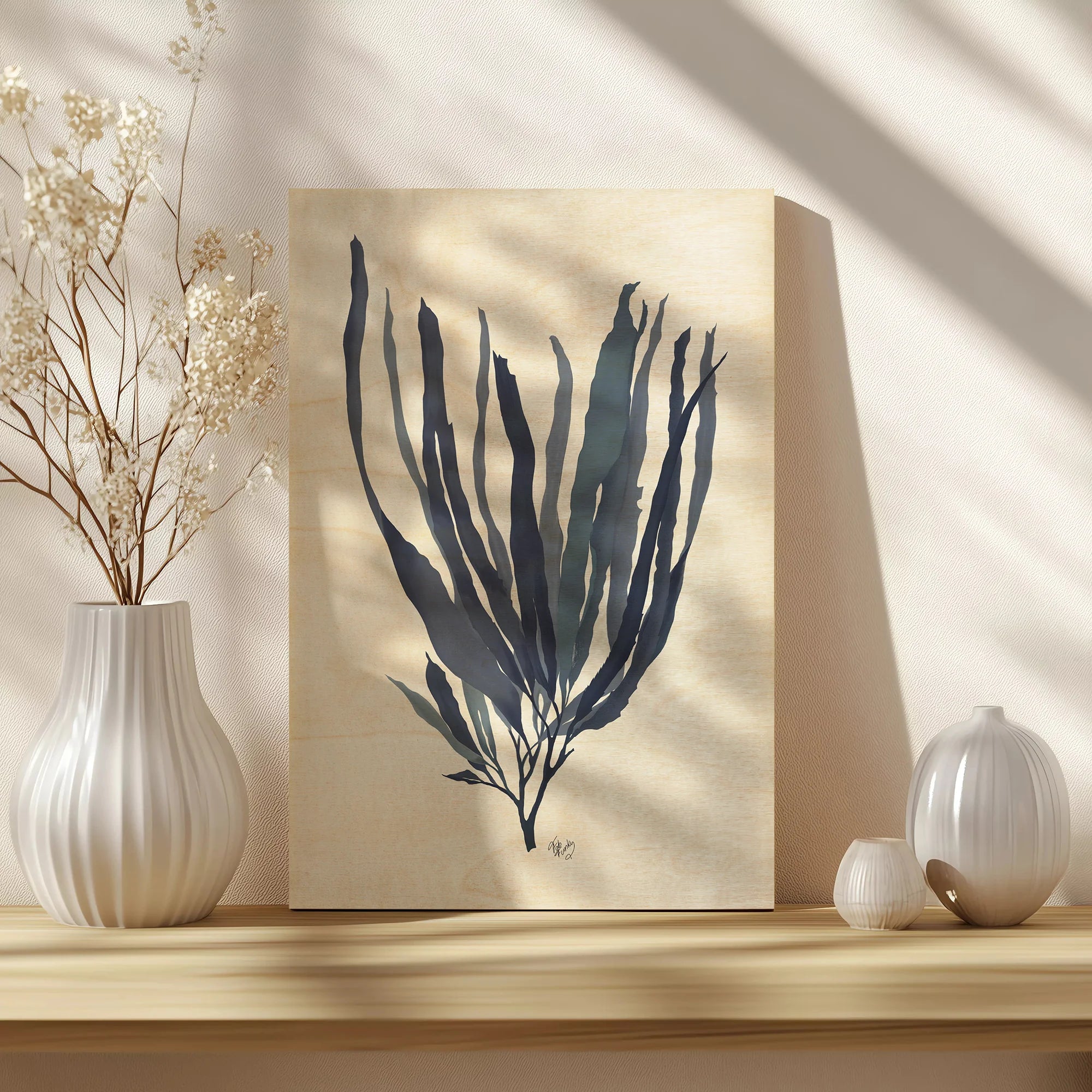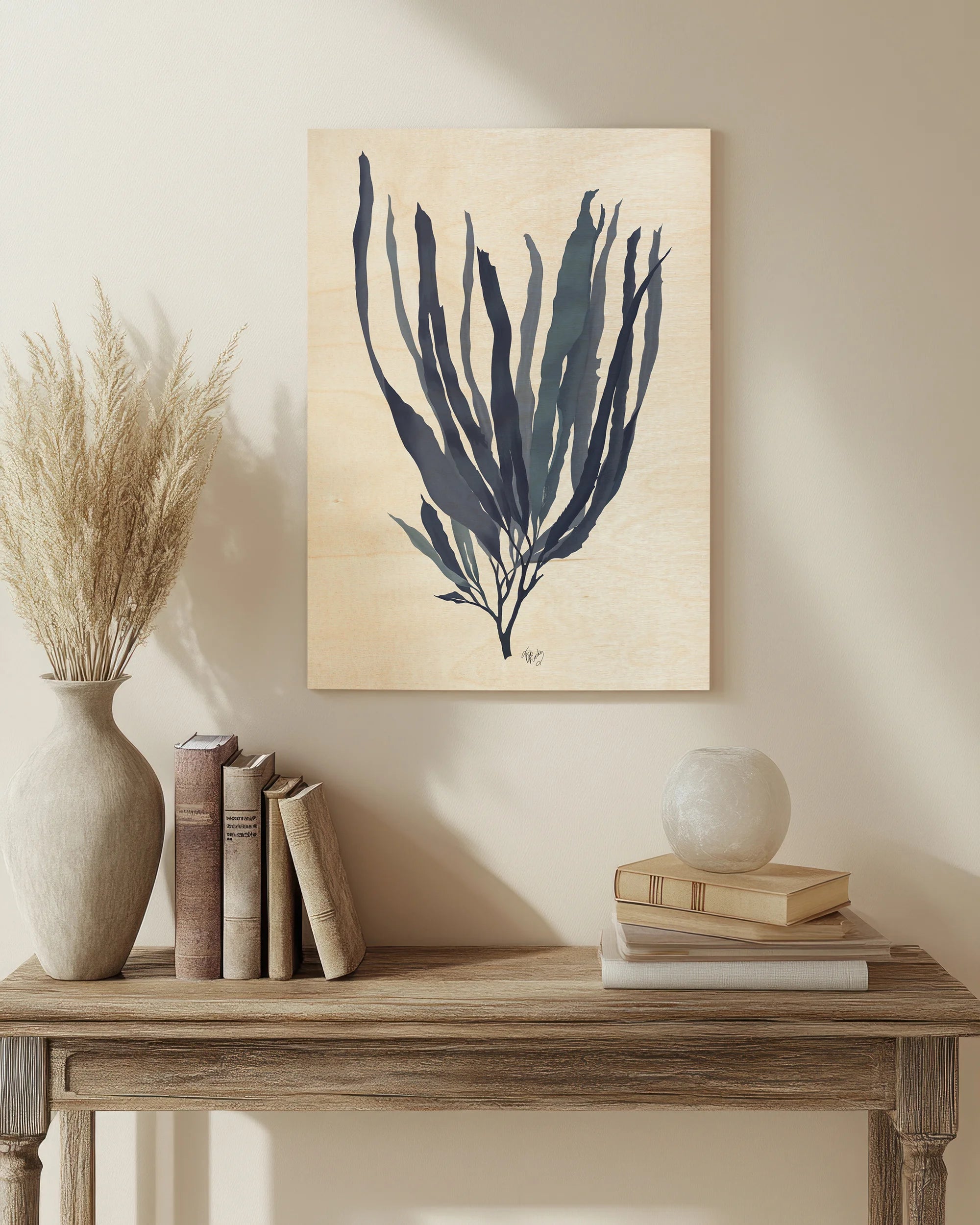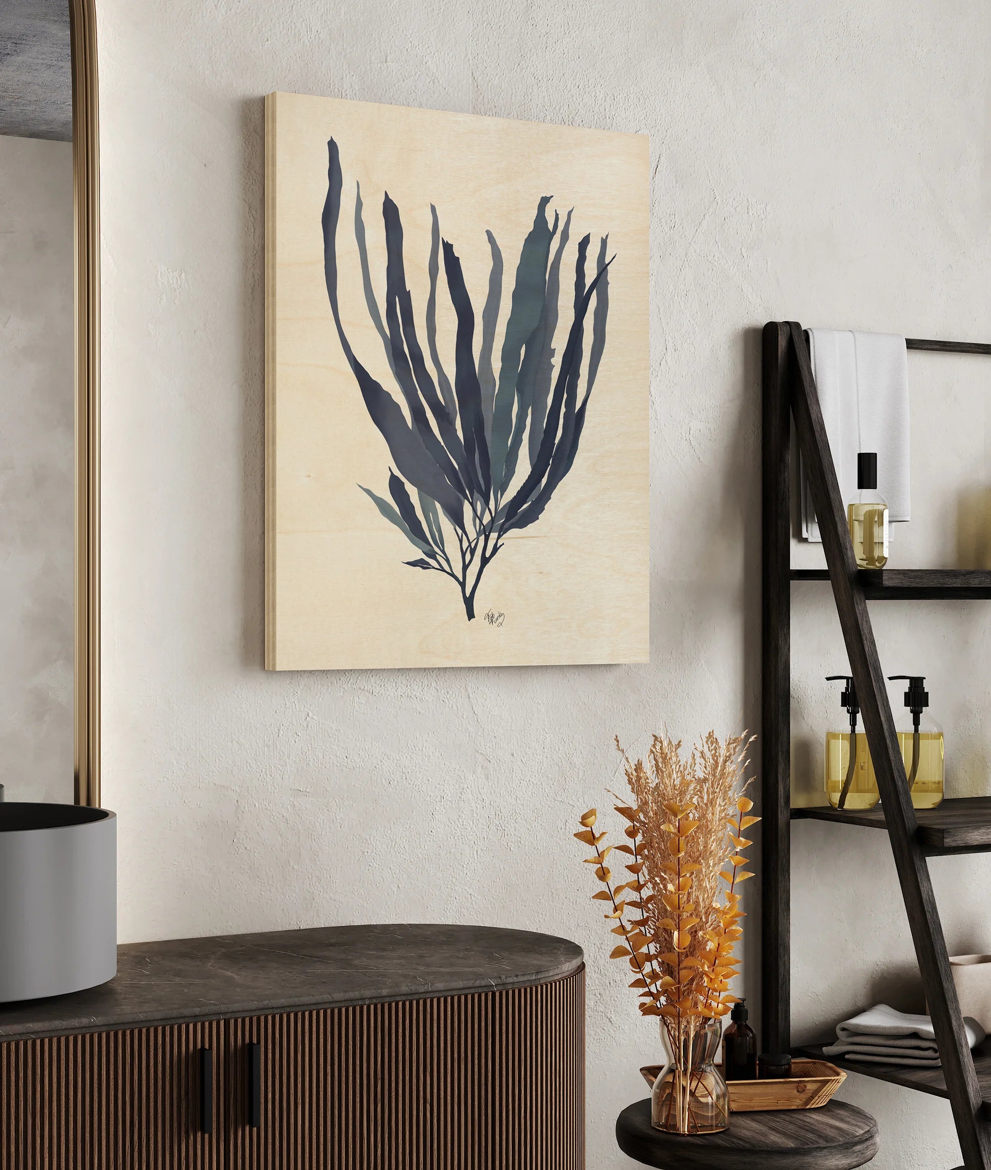 Seaweed 1 Blue Large by Fab Funky is an abstract art print that adds depth and warmth to contemporary home décor. A versatile statement piece, perfect for living spaces, bedrooms, or creative interiors. Printed on premium 12mm Italian Poplar Plywood – finished & printed in Britain.