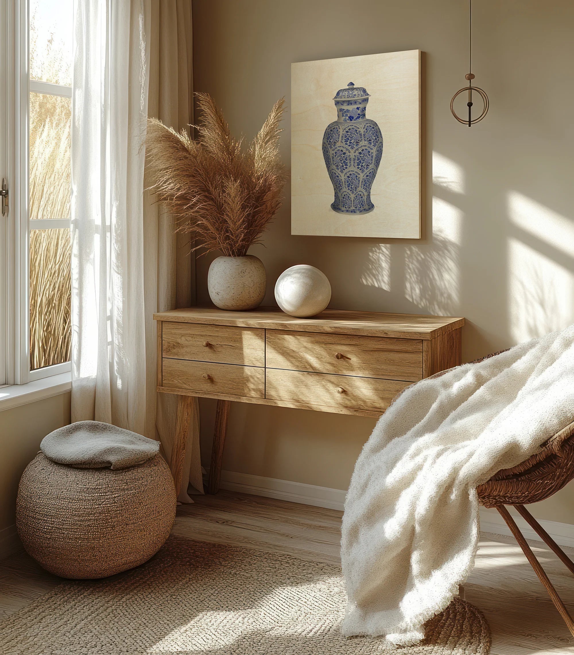 Tall Floral Jar in Blue by Fab Funky is an abstract art print that adds depth and warmth to contemporary home décor. A versatile statement piece, perfect for living spaces, bedrooms, or creative interiors. Printed on premium 12mm Italian Poplar Plywood – finished & printed in Britain.