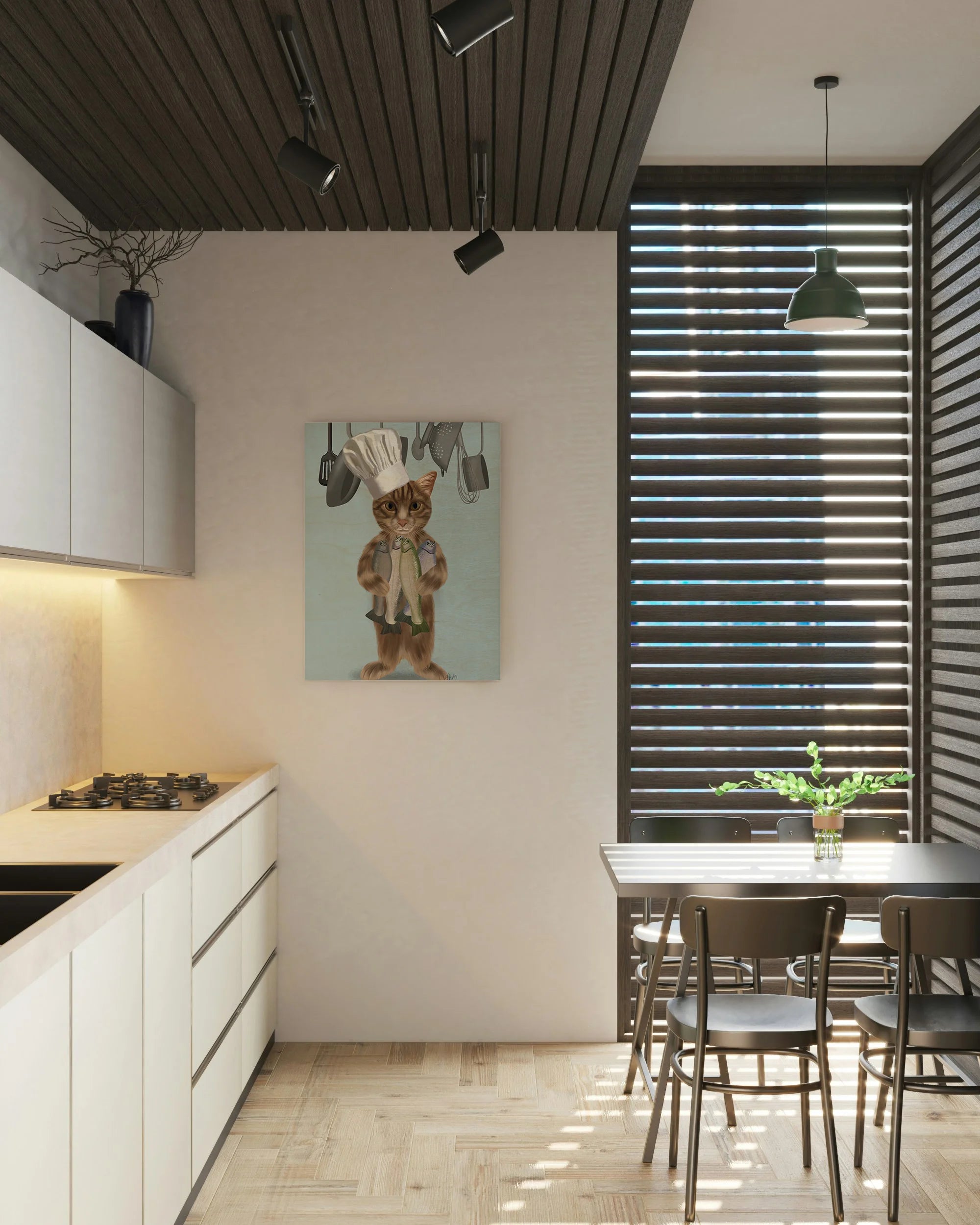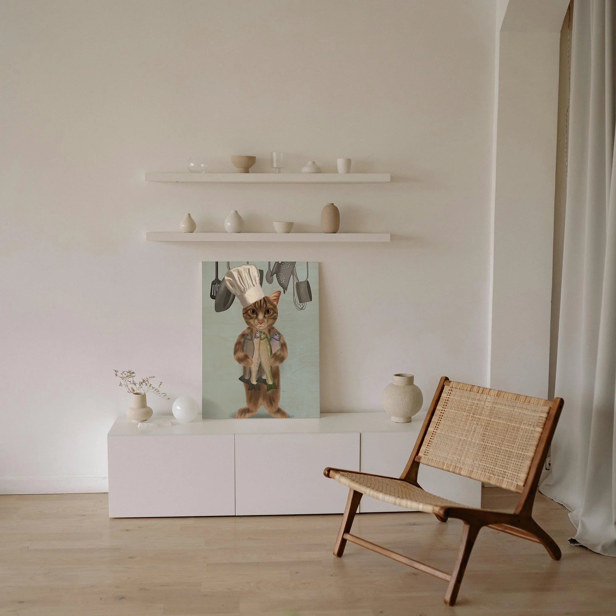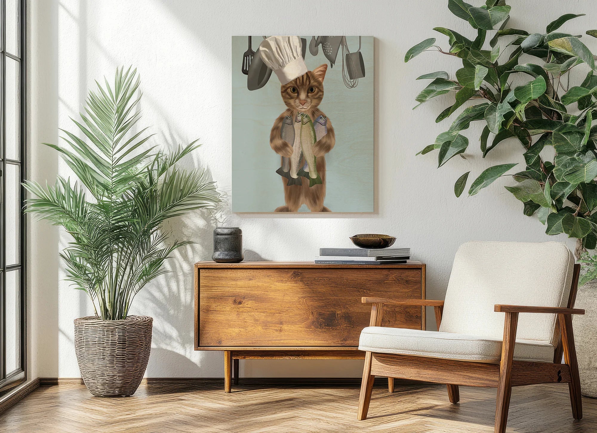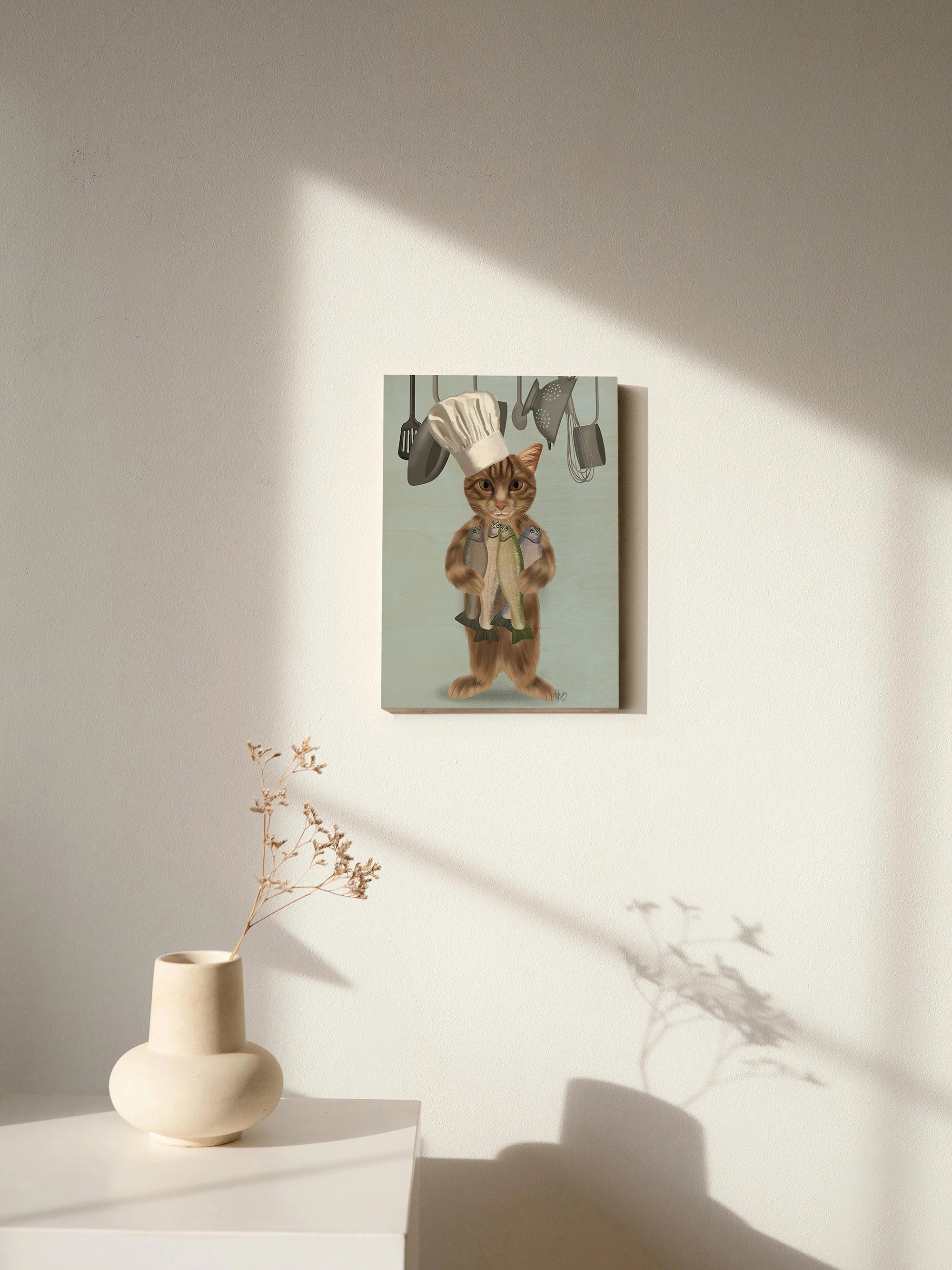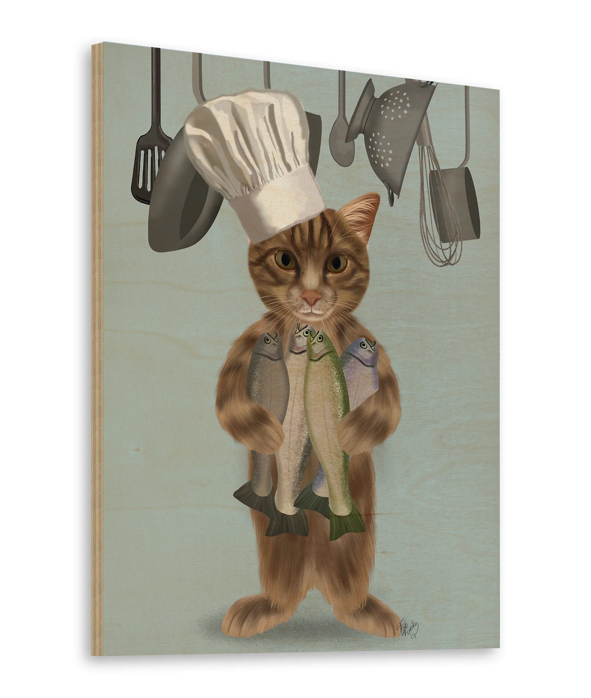 Tabby Cat Fish Chef, Full by Fab Funky is an abstract art print that adds depth and warmth to contemporary home décor. A versatile statement piece, perfect for living spaces, bedrooms, or creative interiors. Printed on premium 12mm Italian Poplar Plywood – finished & printed in Britain.
