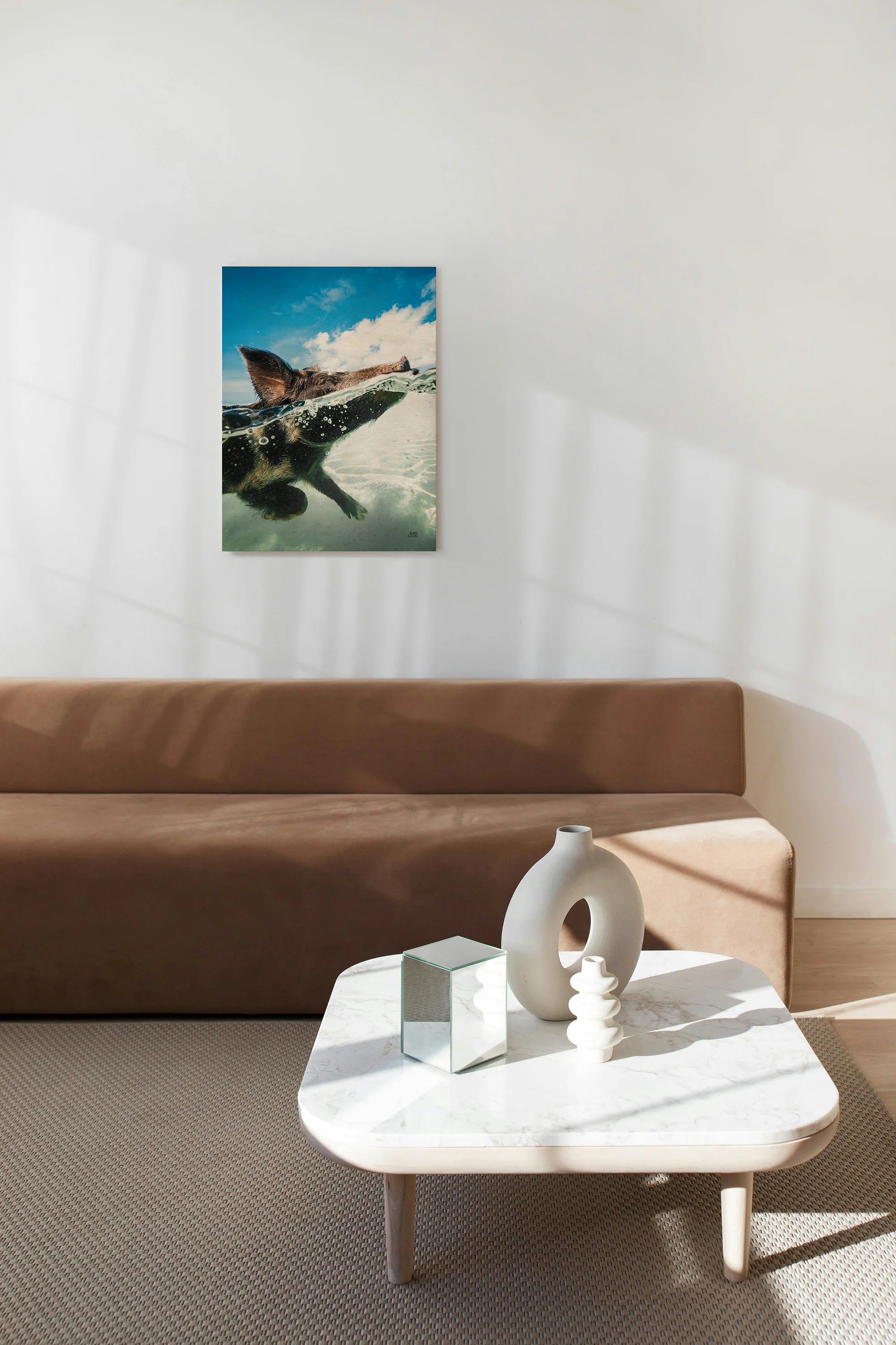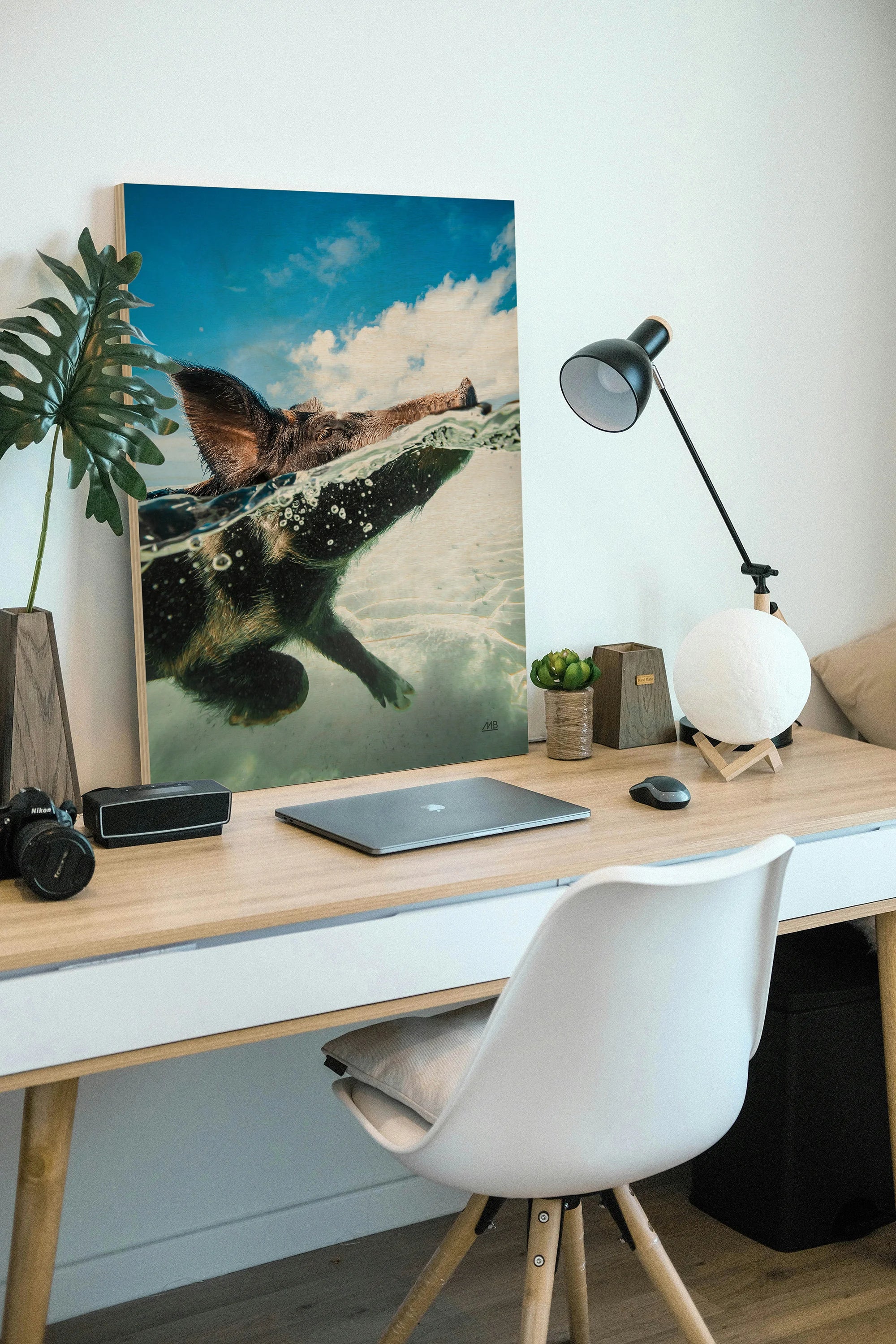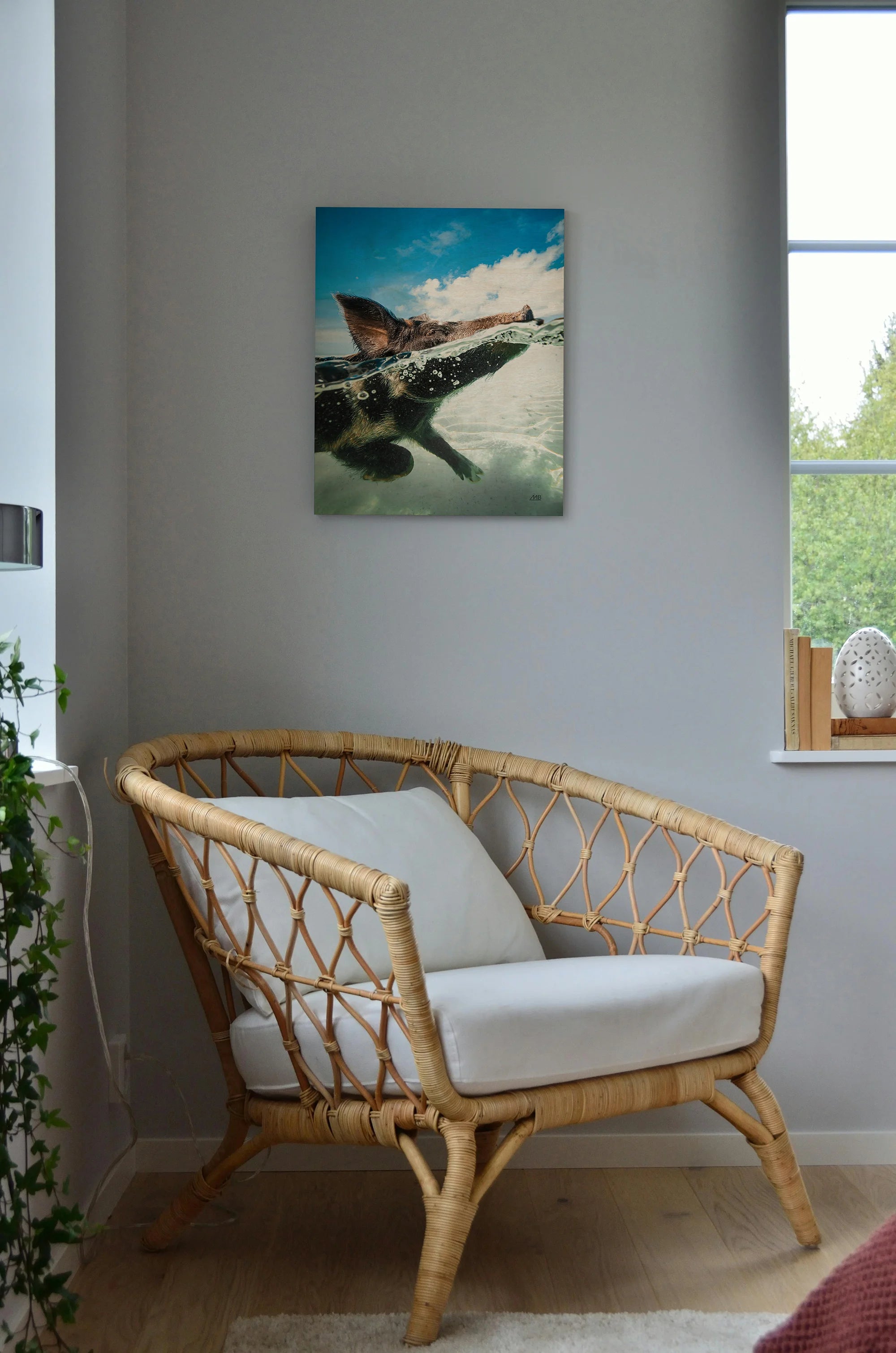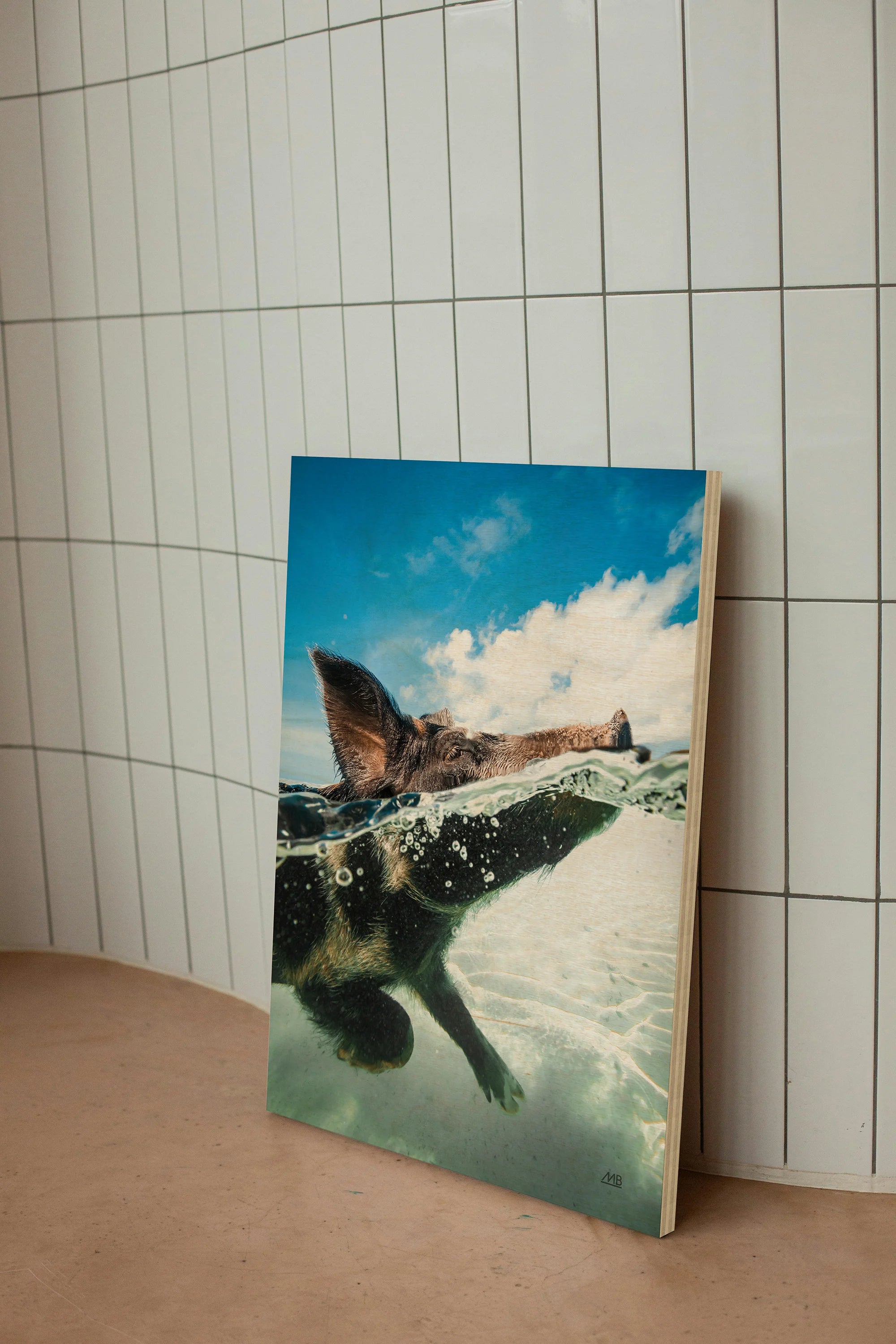 Swimming Pig Print by Max Blakesberg Studios is an abstract art print that adds depth and warmth to contemporary home décor. A versatile statement piece, perfect for living spaces, bedrooms, or creative interiors. Printed on premium 12mm Italian Poplar Plywood – finished & printed in Britain.
