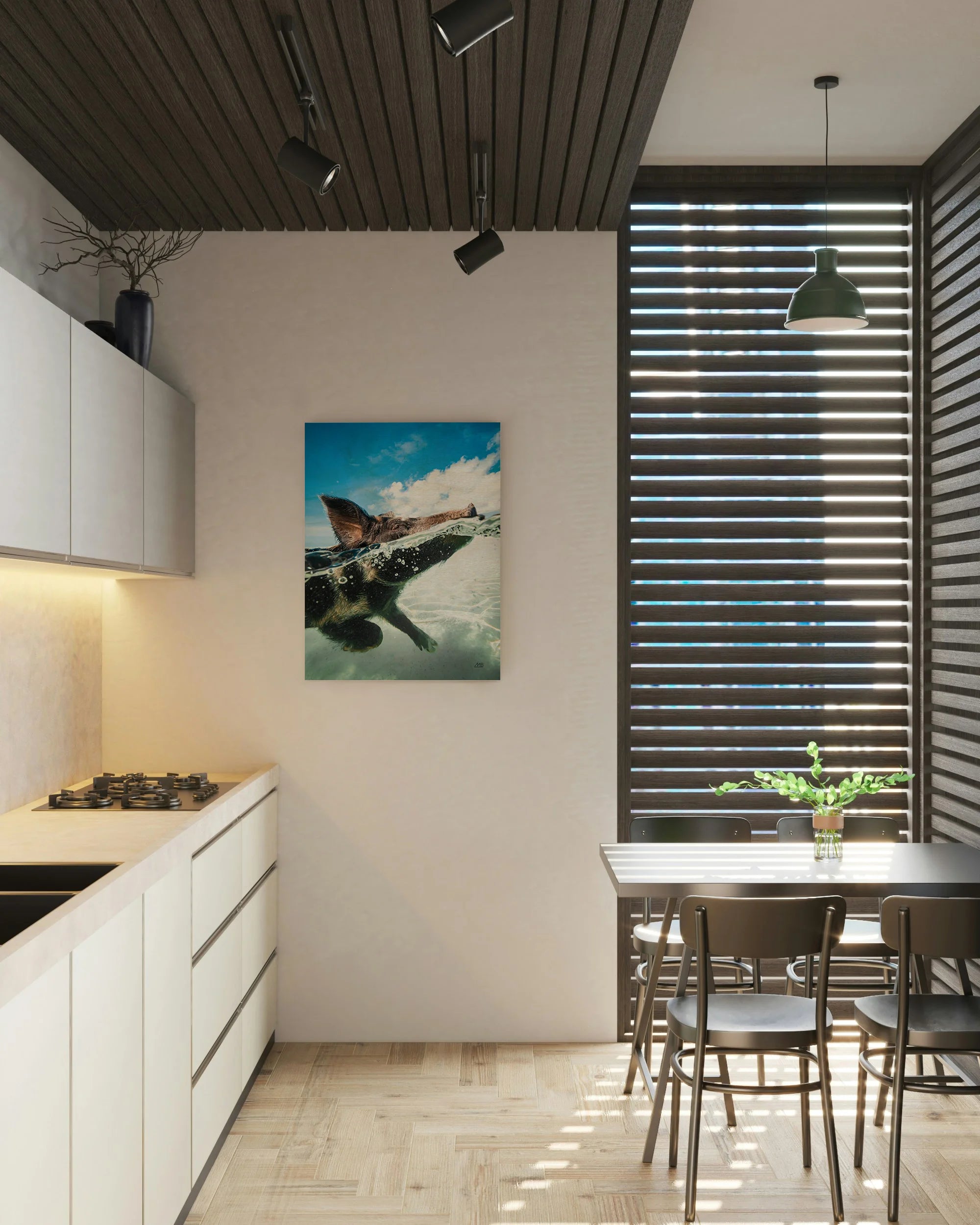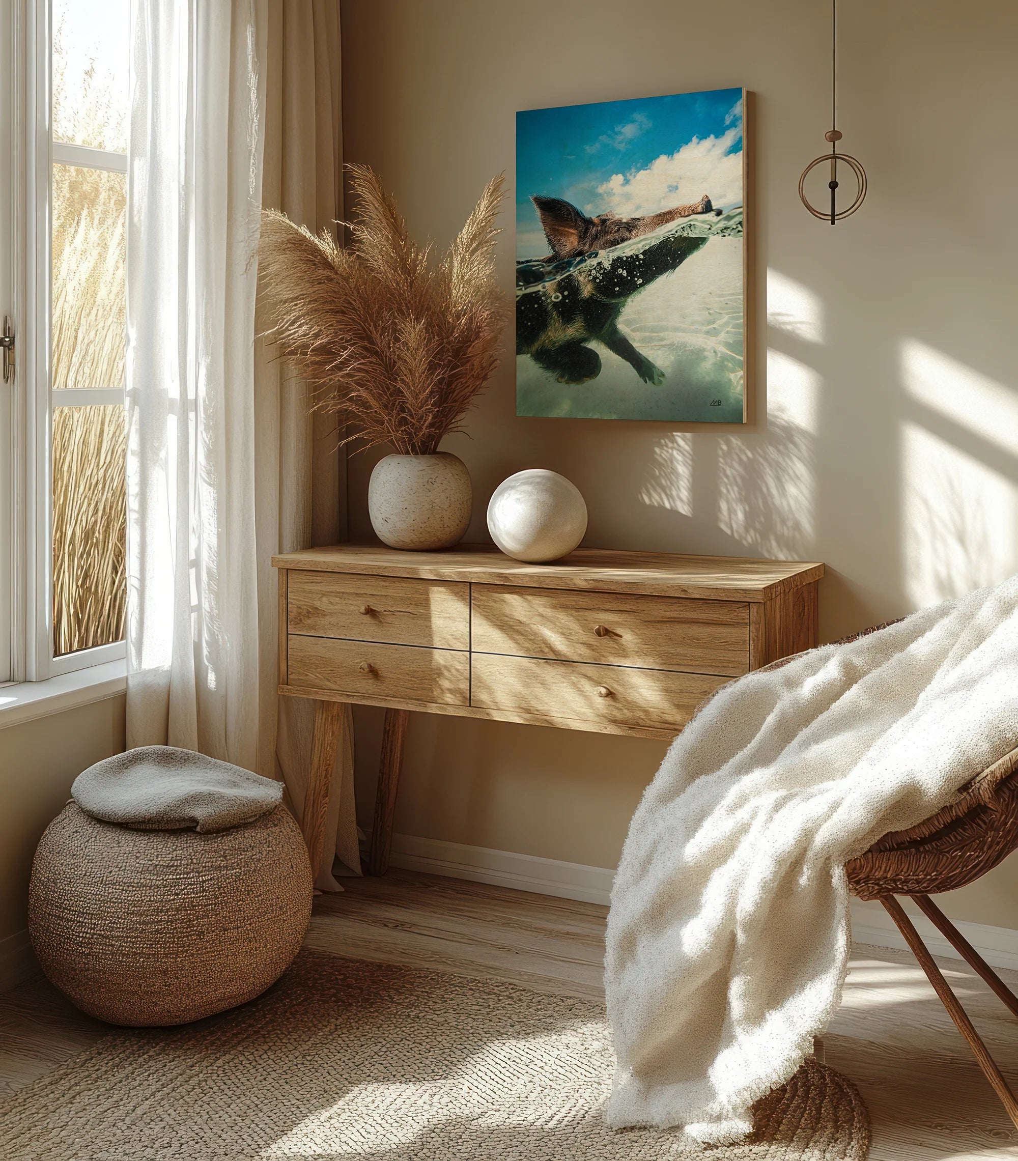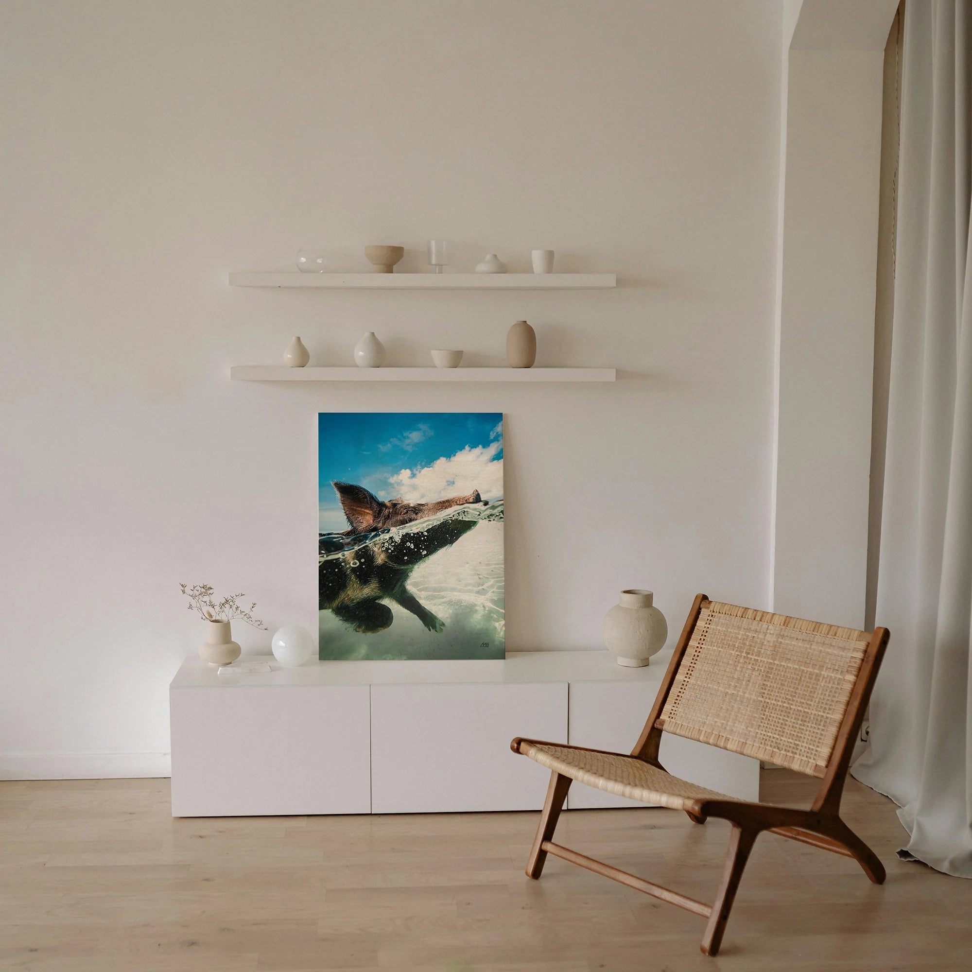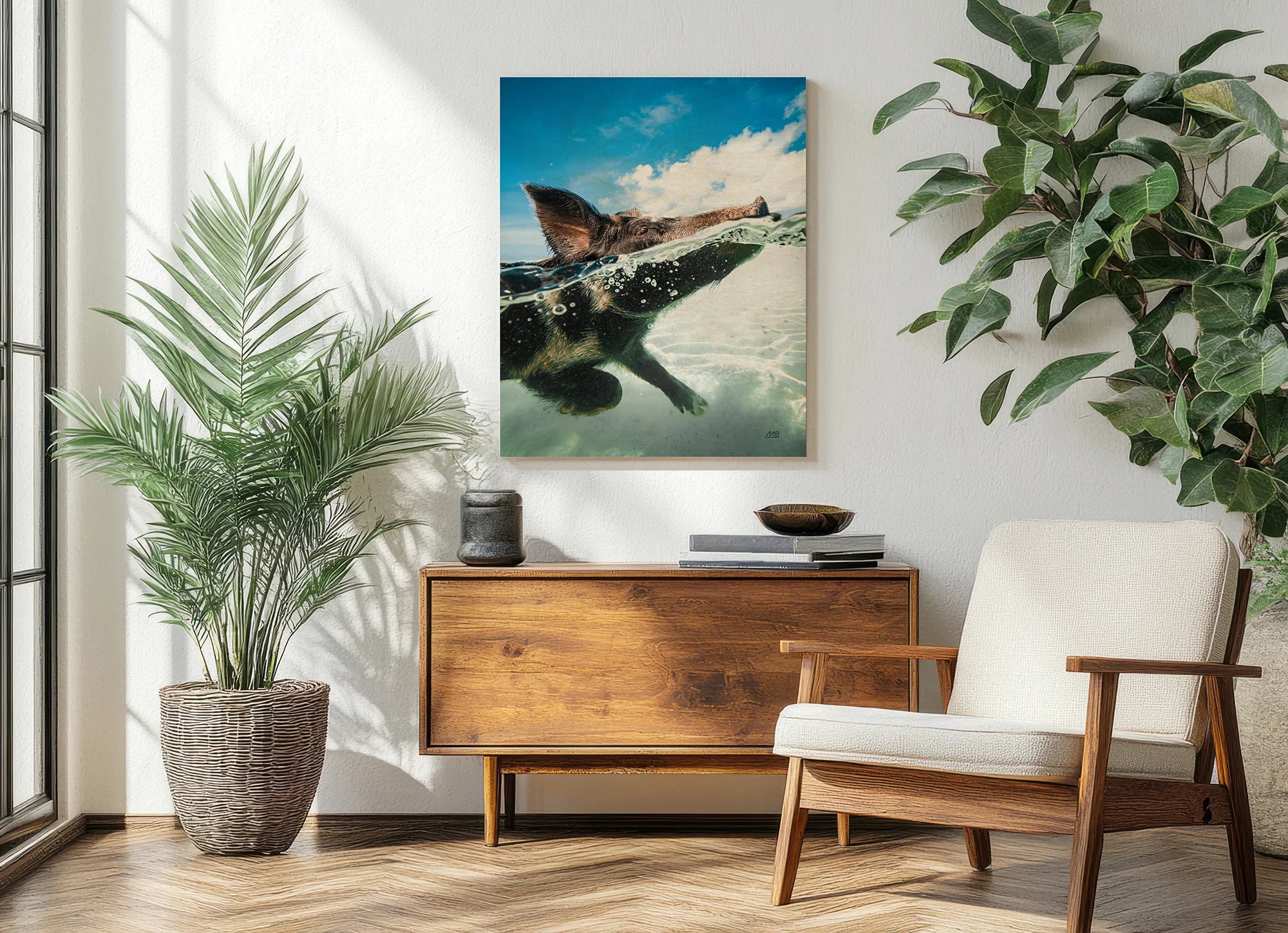Swimming Pig Print by Max Blakesberg Studios is an abstract art print that adds depth and warmth to contemporary home décor. A versatile statement piece, perfect for living spaces, bedrooms, or creative interiors. Printed on premium 12mm Italian Poplar Plywood – finished & printed in Britain.