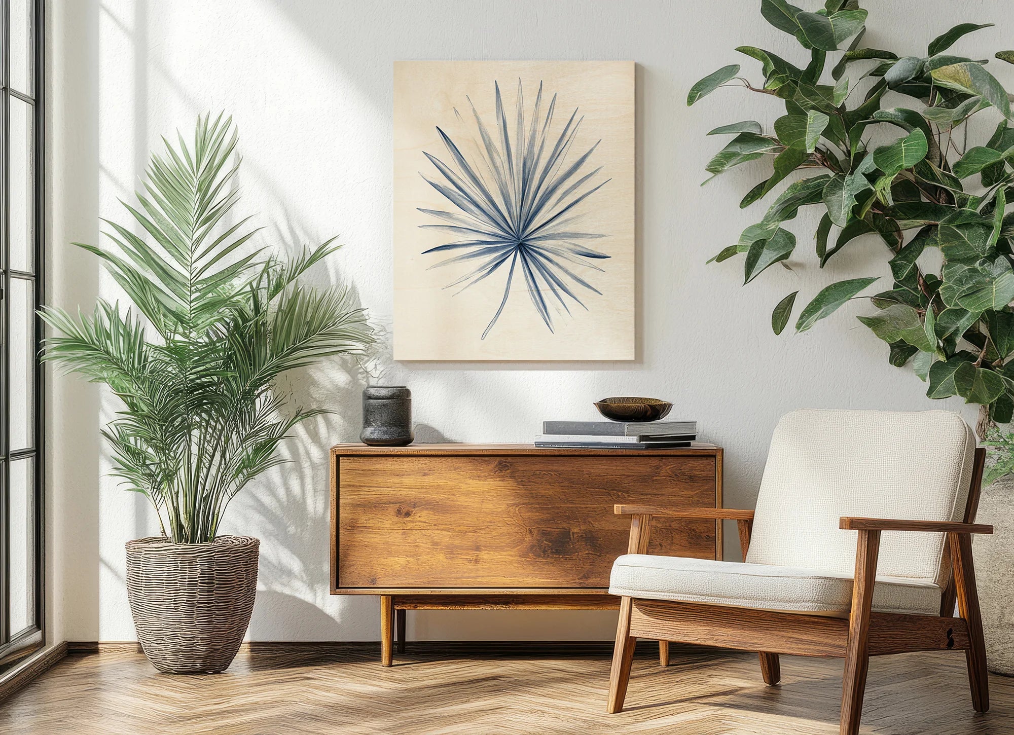 Indigo Tropical Leaves II by Megan Meagher is an abstract art print that adds depth and warmth to contemporary home décor. A versatile statement piece, perfect for living spaces, bedrooms, or creative interiors. Printed on premium 12mm Italian Poplar Plywood – finished & printed in Britain.