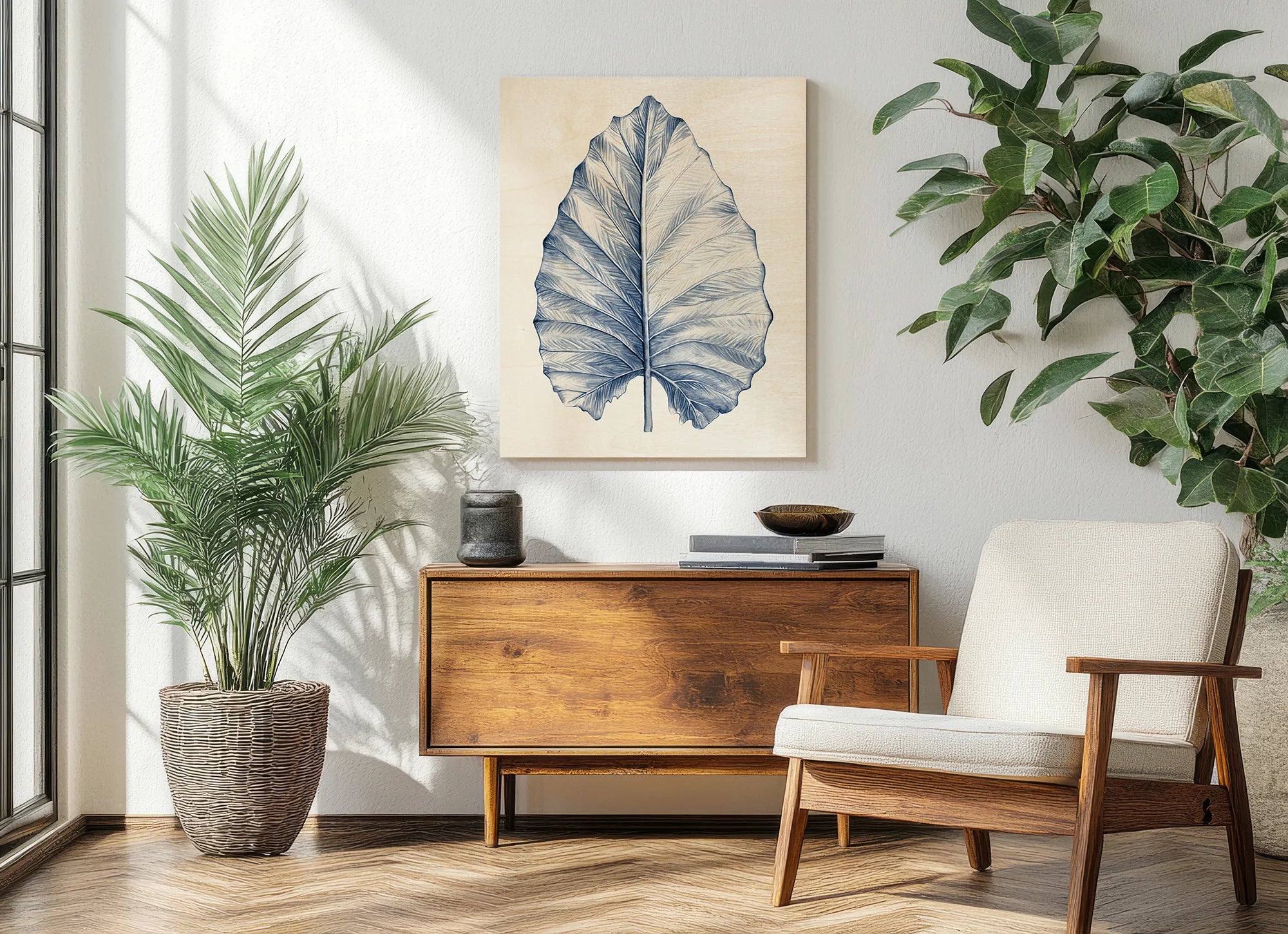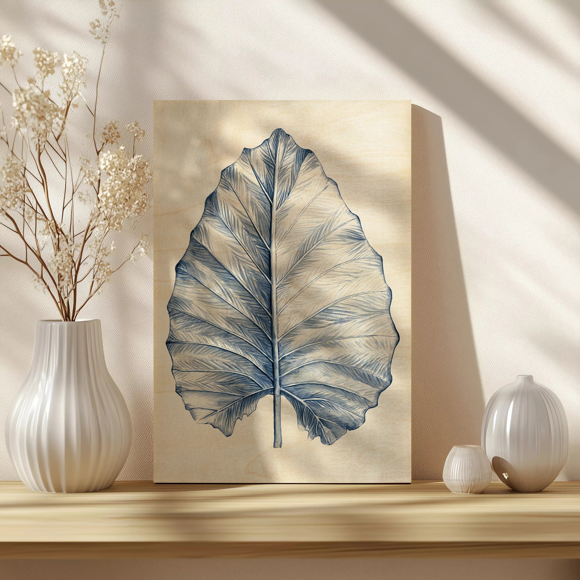 Indigo Tropical Leaves III by Megan Meagher is an abstract art print that adds depth and warmth to contemporary home décor. A versatile statement piece, perfect for living spaces, bedrooms, or creative interiors. Printed on premium 12mm Italian Poplar Plywood – finished & printed in Britain.