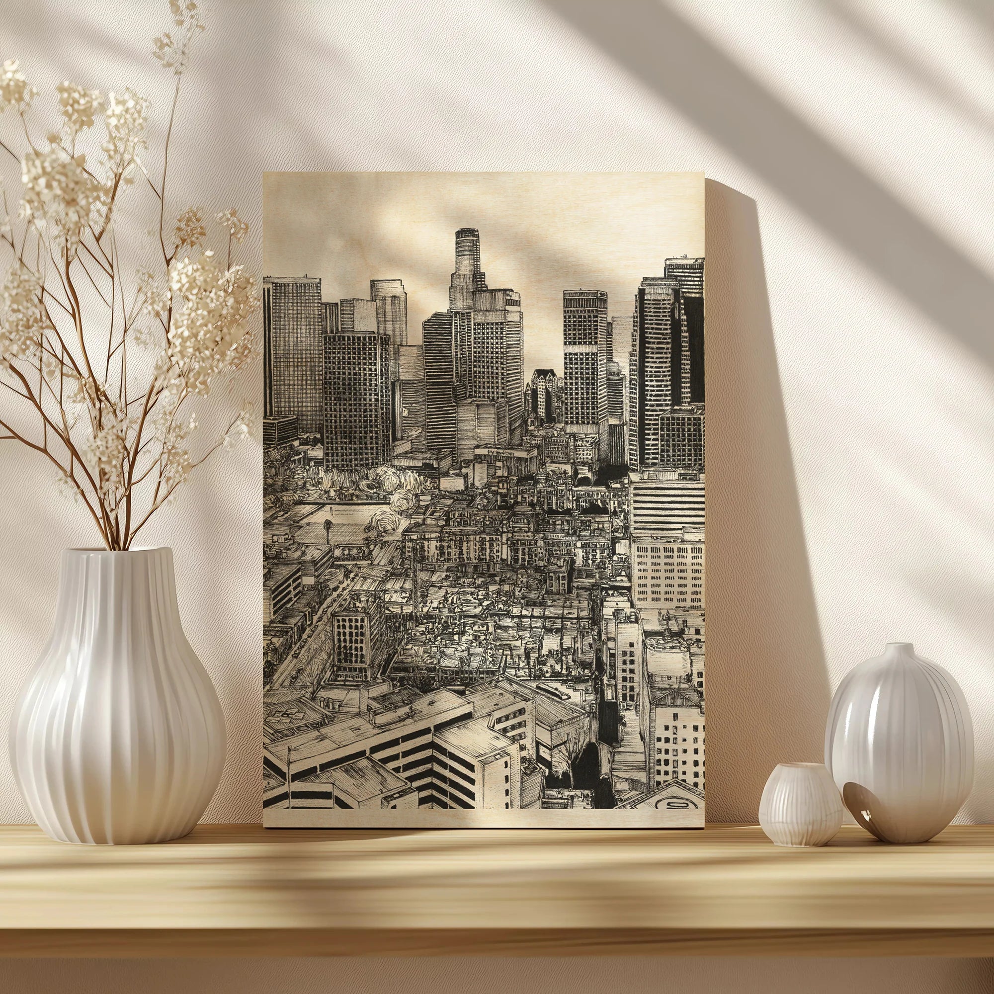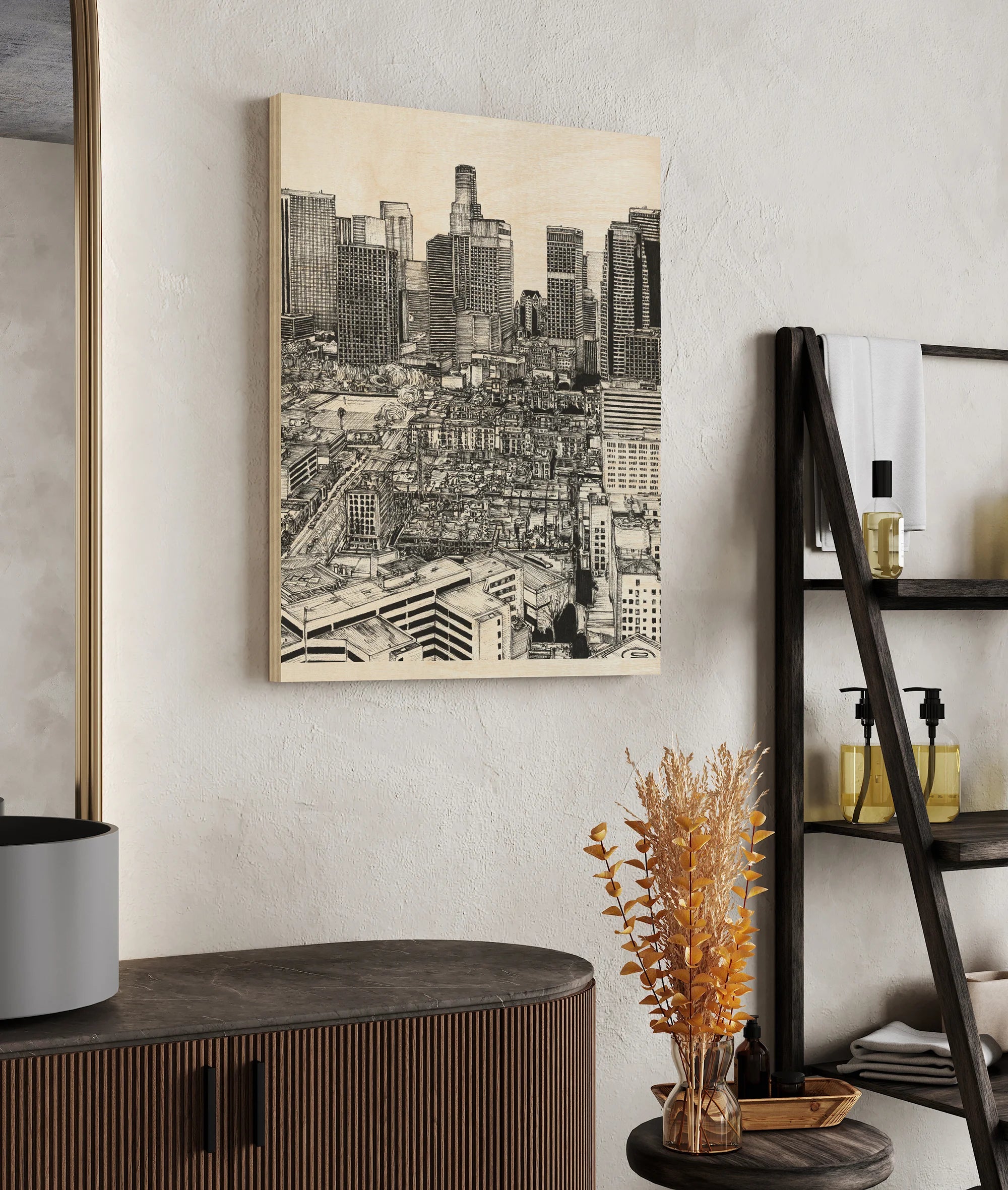 B&W US Cityscape-Los Angeles by Melissa Wang is an abstract art print that adds depth and warmth to contemporary home décor. A versatile statement piece, perfect for living spaces, bedrooms, or creative interiors. Printed on premium 12mm Italian Poplar Plywood – finished & printed in Britain.