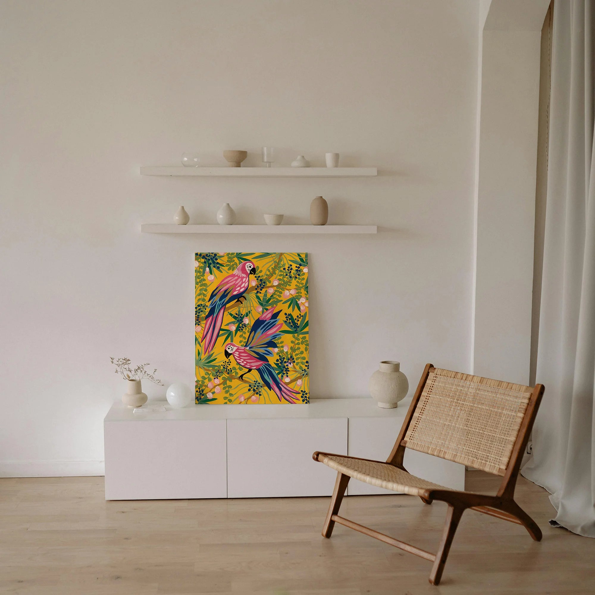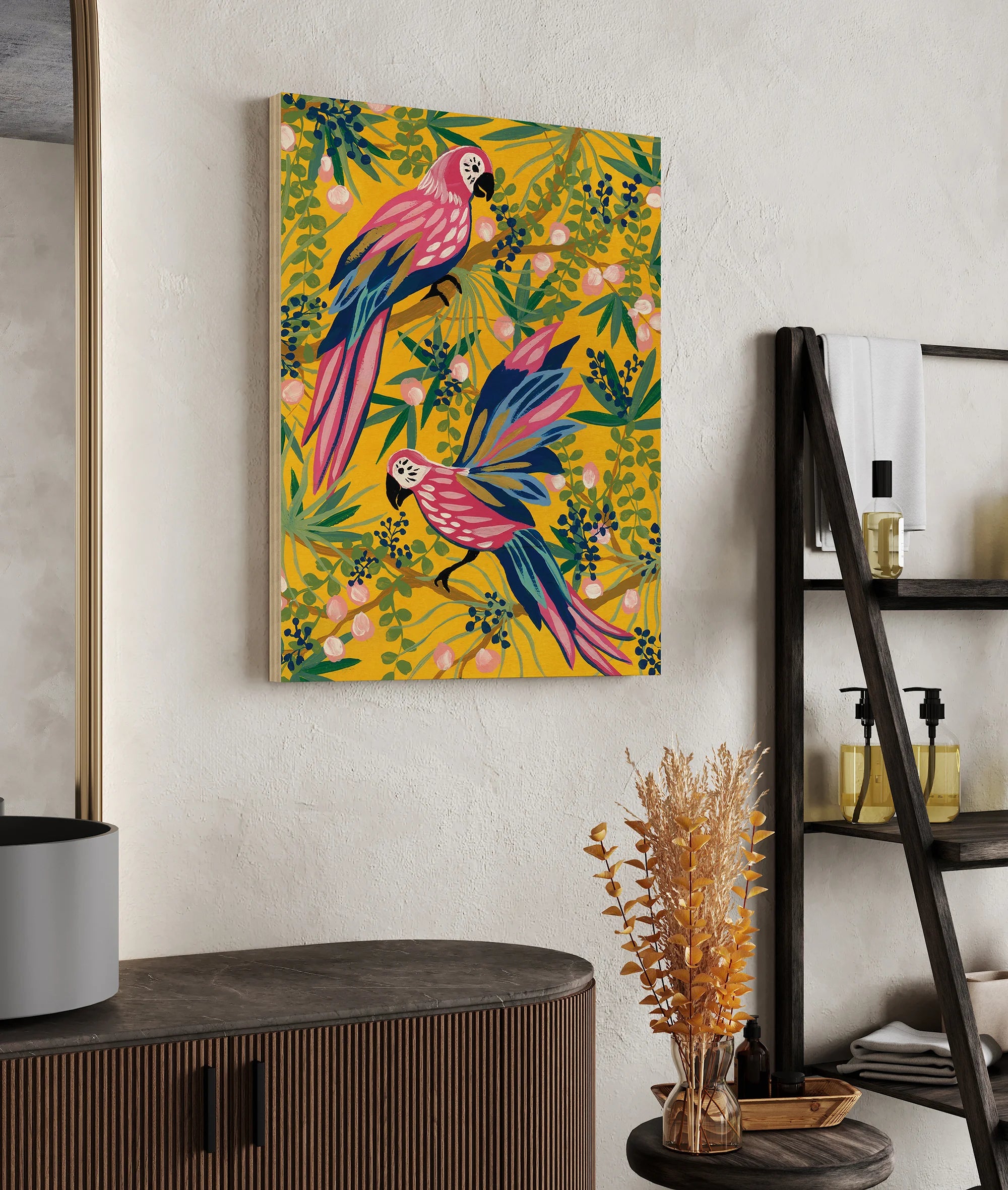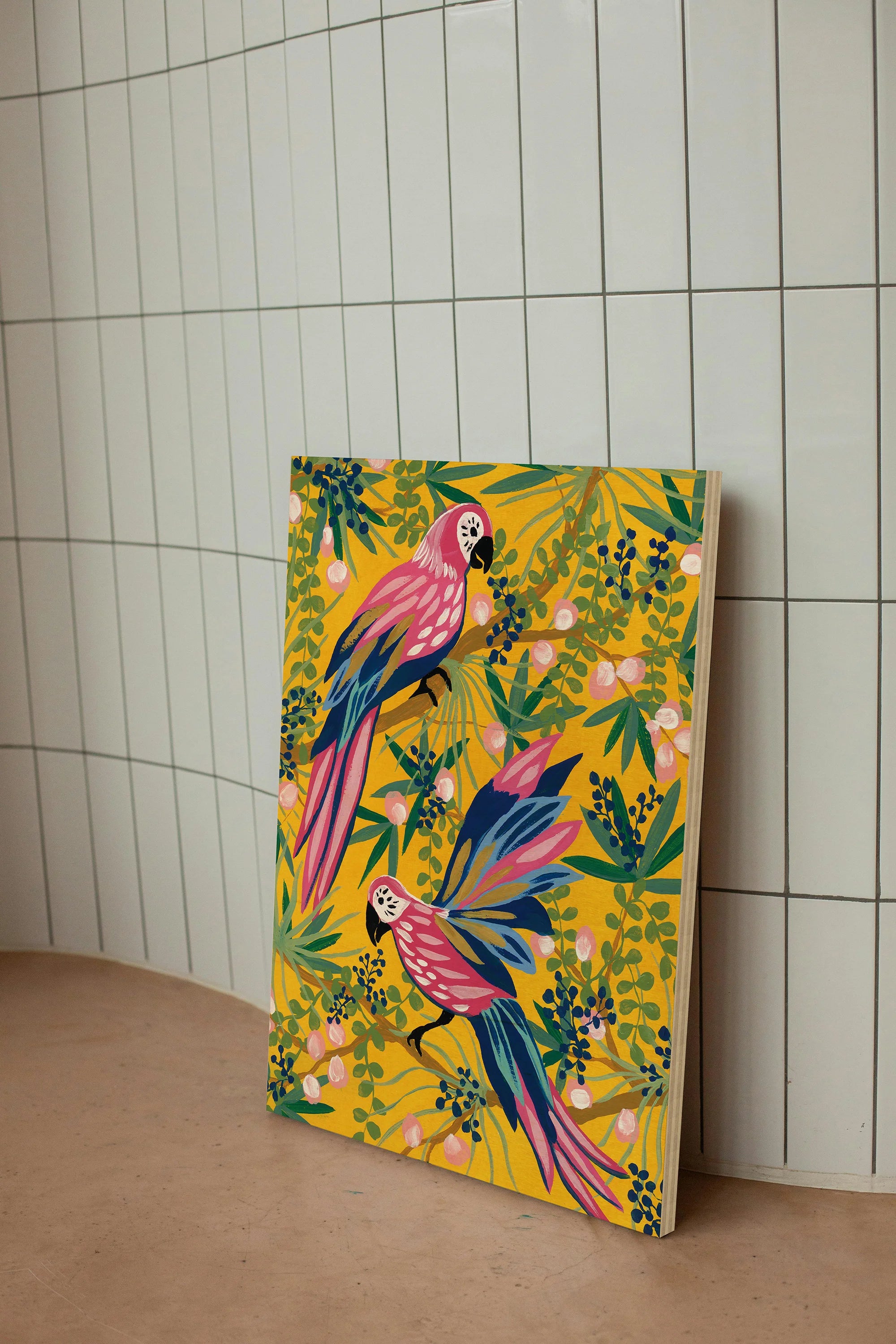 Maximalist Parrots Print by Yvette St. Amant is an abstract art print that adds depth and warmth to contemporary home décor. A versatile statement piece, perfect for living spaces, bedrooms, or creative interiors. Printed on premium 12mm Italian Poplar Plywood – finished & printed in Britain.