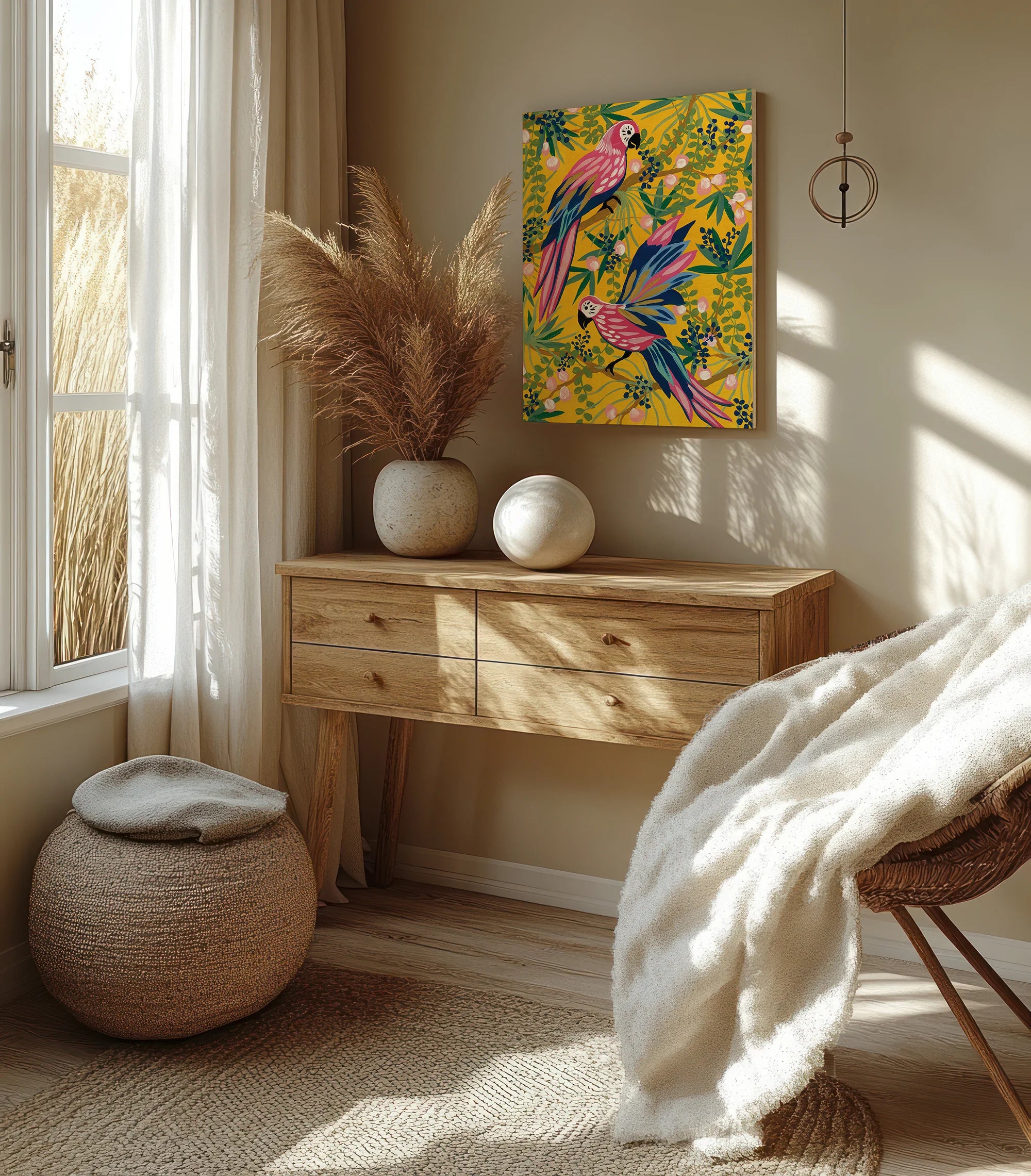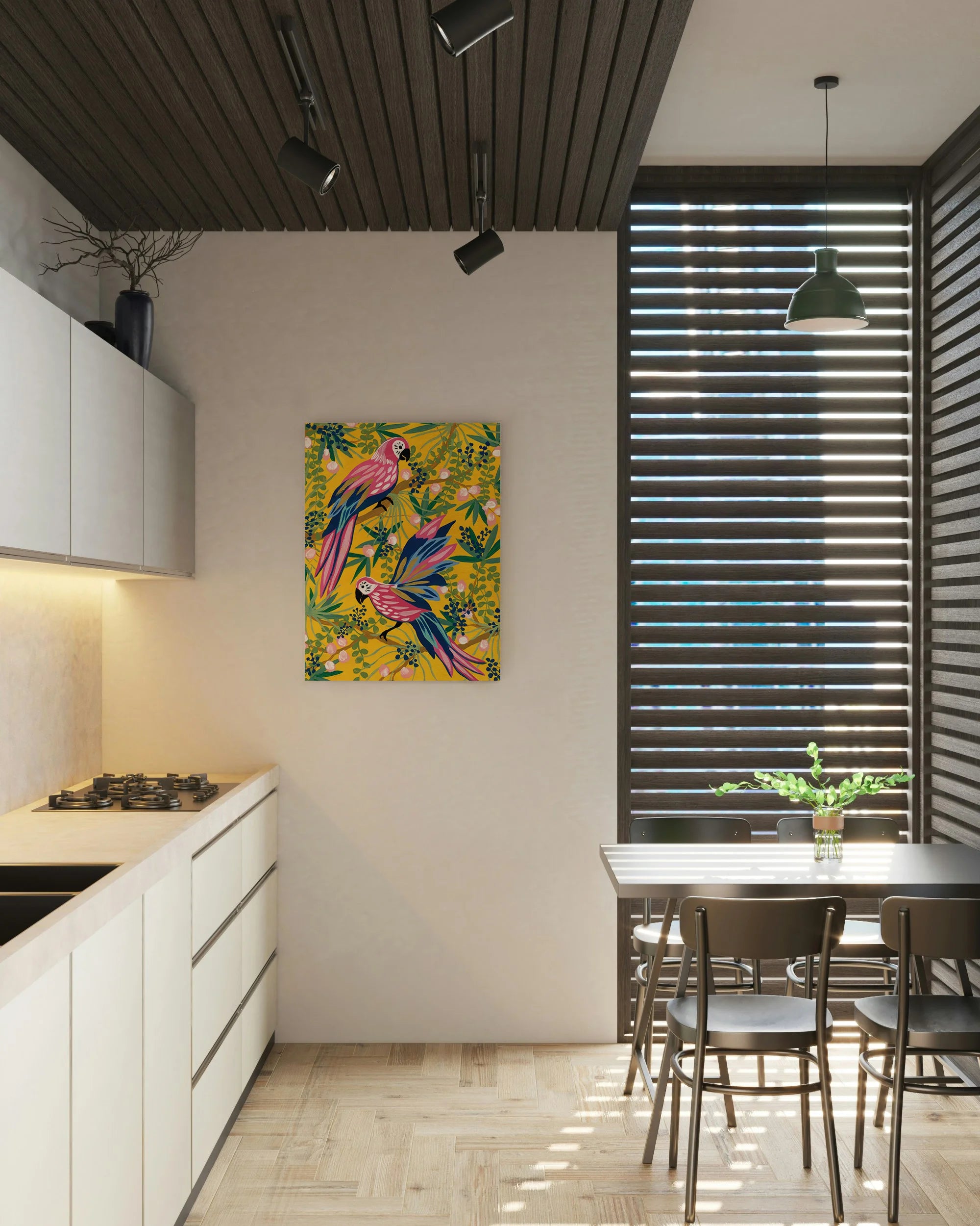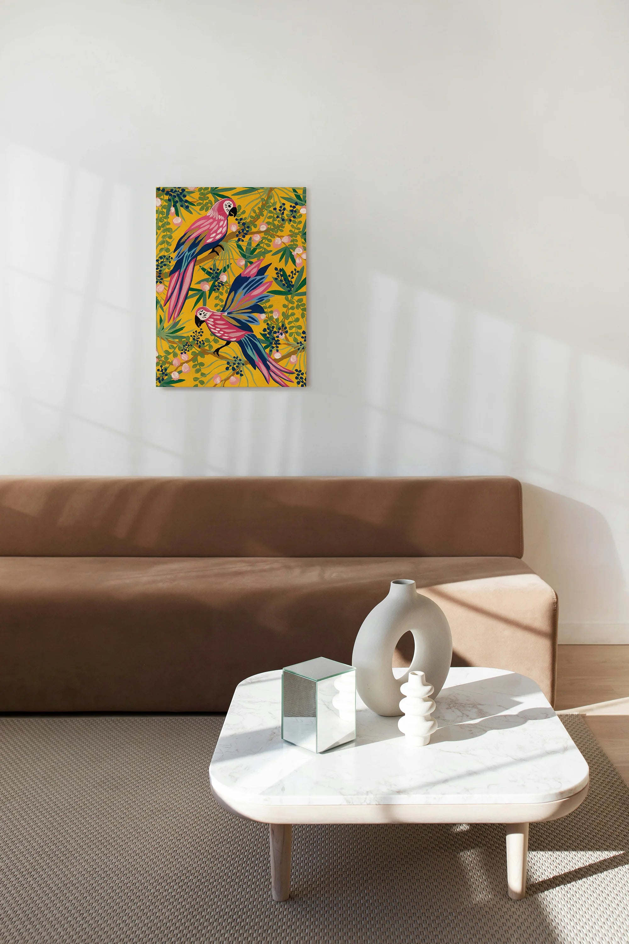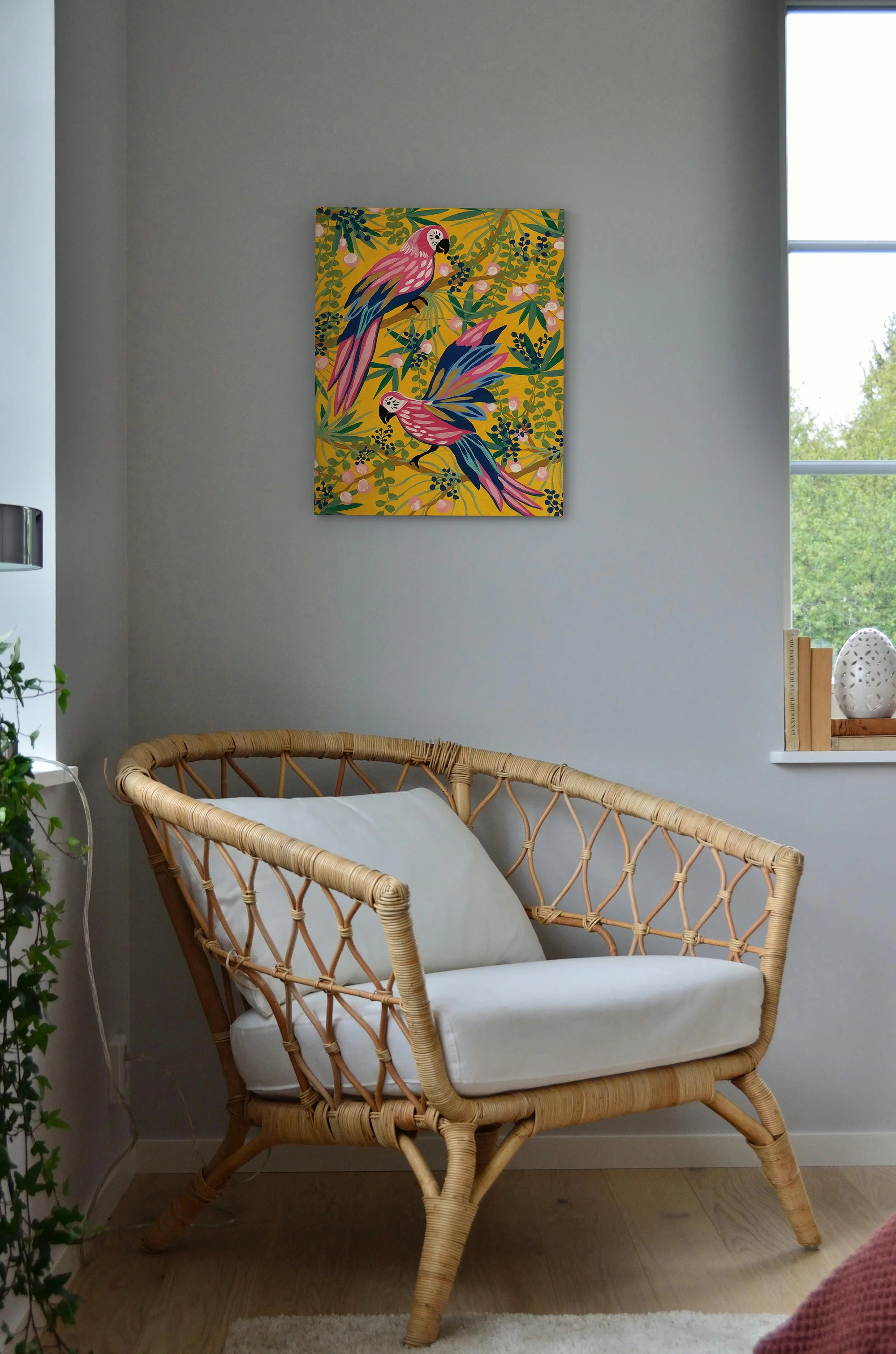 Maximalist Parrots Print by Yvette St. Amant is an abstract art print that adds depth and warmth to contemporary home décor. A versatile statement piece, perfect for living spaces, bedrooms, or creative interiors. Printed on premium 12mm Italian Poplar Plywood – finished & printed in Britain.