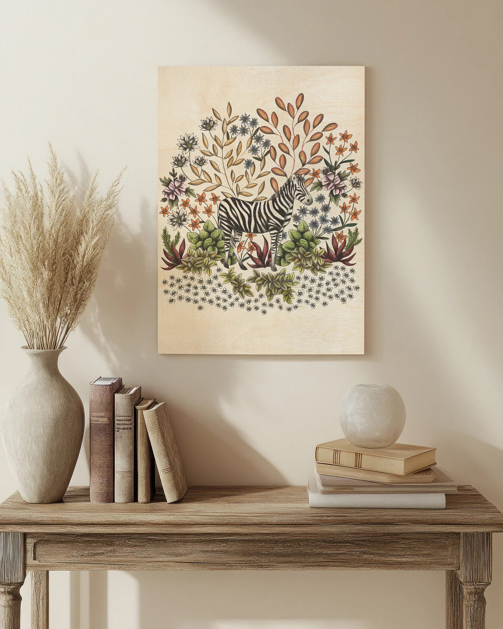 Safari Zebra is an original artist-designed print by Cecilia Battaini. Each piece is UV printed onto premium natural plywood, allowing her unique artistic style to shine through while celebrating the organic beauty of the timber beneath.